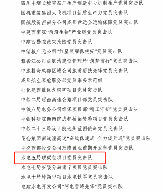 日前,中共四川省國有資產(chǎn)監(jiān)督管理委員會委員會印發(fā)《關(guān)于選樹一批國有企業(yè)示范黨支部、黨員突擊隊(黨員服務(wù)隊)的通報》,中國水電五局硬梁包廠區(qū)樞紐工程項目“硬梁先鋒?電亮高原”黨員突擊隊憑借在國家重大工程建設(shè)中的突出表現(xiàn)、卓越攻堅能力和積極社會責任擔當,成功獲評“國有企業(yè)黨員突擊隊”榮譽稱號,成為全省國企基層黨組織和黨員隊伍的示范標桿。