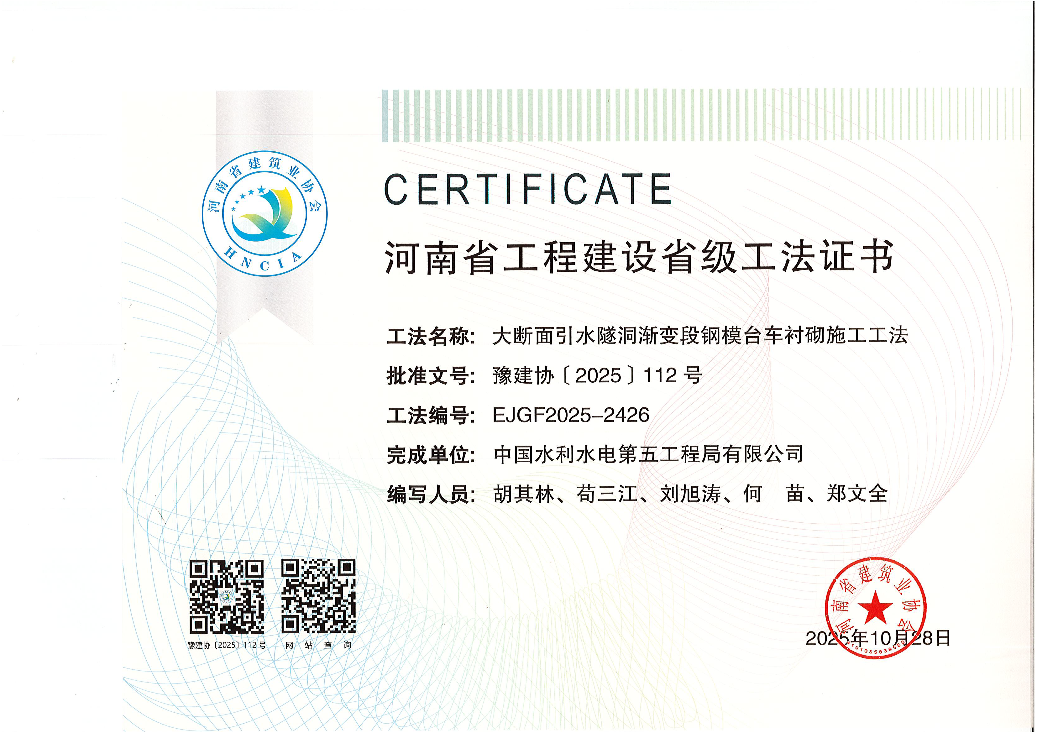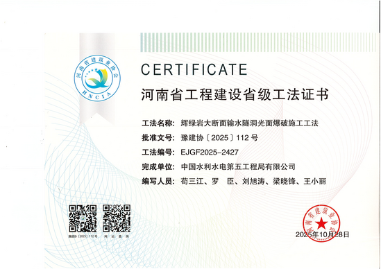 日前,公司引江補漢項目團隊申報的《水利工程大縱坡施工支洞襯砌施工工法》等3項成果獲得河南省省級工法認定,至此,引江補漢項目技術團隊全年共獲得省部級工法9項,2025年工法“小目標”圓滿完成。