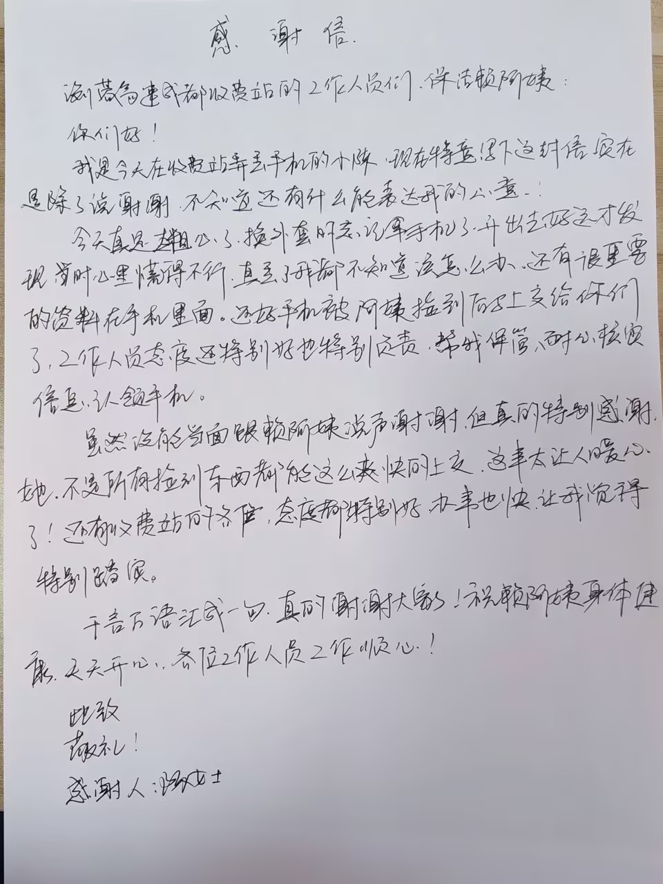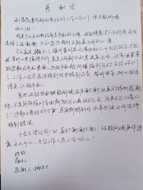 當?shù)弥敖鸩幻恋墓ぷ魅藛T賴阿姨因輪崗未能碰面時,陳女士當即提出要留下書面感謝信,以表達對賴阿姨的誠摯謝意。